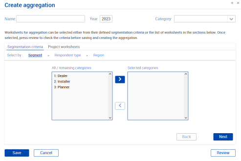 To display aggregated output, you define the worksheets to be included, either by using the defined segmentation criteria or selecting the worksheets to be included ( all worksheets is an option). To create a new aggregation, click on the new button in the toolbar to display the following dialog.