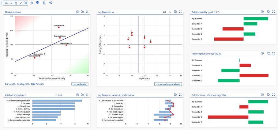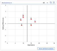The Attribute Chart shows the importance of the purchase criteria in the horizontal axis and this business’ performance relative to its competitors in the vertical axis (i.e. average rating difference).