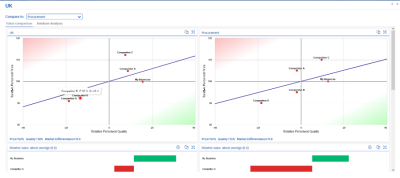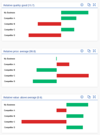 - The relative quality chart show positive (above average) quality in green and competitors with below average in green.
