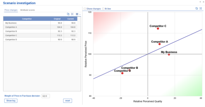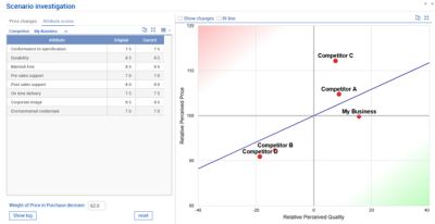 button launches the scenario analysis module. This allows you to investigate the effects prices changes, attribute scores and the effect the slope of the fair value line on the value propositions of the competitors.