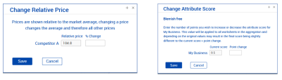 When making changes to the relative prices and attribute scores it is important to note that the change might not be as big as you expect. Where prices are concerned, because they are relative, changing one competitor’s relative price will change the relative price of the others in the opposite direction, but by a smaller amount. When you suggest a change in attribute score, we change the score for that competitor by that amount on each worksheet (unless it would exceed 10 or be less than 1) and then recalculate the summary, which again could mean that the effect is less than expected. Shown below are the two change dialogs.