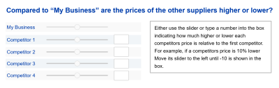 With the business being analysed as the benchmark, ask the interviewee whether competitors prics are higher or lower, and by how much in percentage terms.