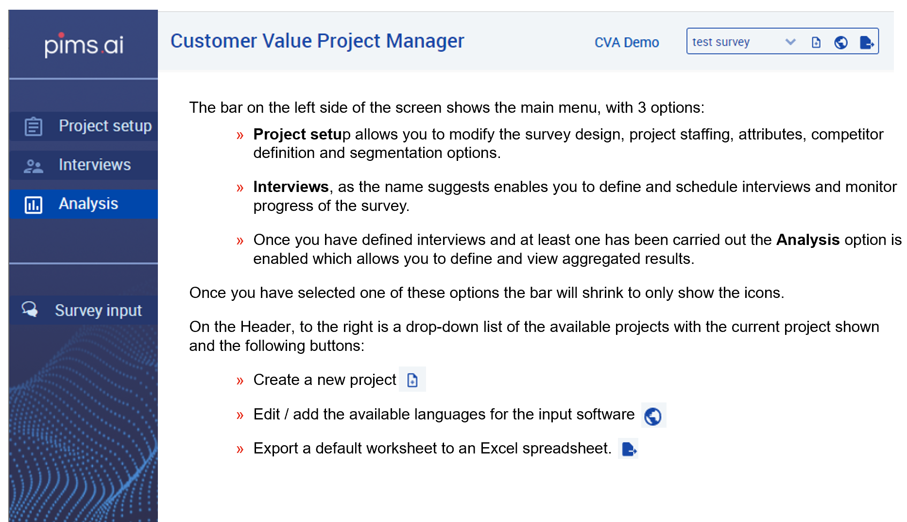 - The CVA project manager is used to define the scope of the project, schedule interviews and analyse results.