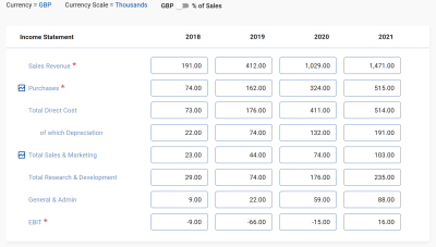 The following fields can either be entered (and displayed) as values or as a % of sales by switching the toggle at the top of the screen.
