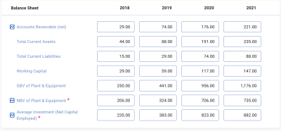 As in the Income statement, the balance sheet fields can either be entered (and displayed) as values or as a % of sales by switching the toggle at the top of the screen: