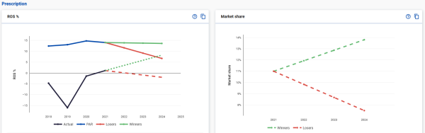 Prescription shows the trend for strategic peers which improved PAR ROS (winners) vs those whose PAR ROS decreased (losers) extrapolated from your data in the chart to the left, and the potential changes for a key indicator to the right. In both charts the area between the green and red lines represents the likely range of outcomes for your business.