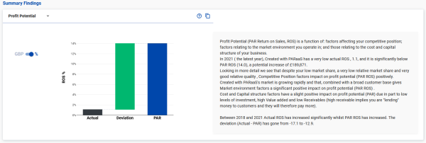 for businesses with similar capital intensity to yours, and is a measure of how your PAR ROS (shown as a horizontal line) compares. The charts is divided into 5 ranges (or quintiles) with the middle bar representing average values. In this case the range of PAR for this business is above average, i.e. it's potential is above average.