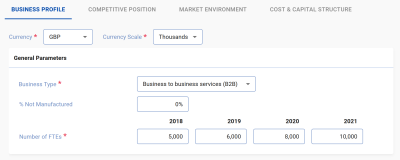 At the top of this section you define the currency and scale to use when entering financial data. The rest of the screen is split into 2 sections:
