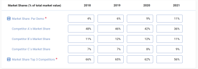 - The market share of each of the 3 largest competitors in the market in descending order of share.