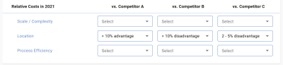 versus each competitor in the latest year, i.e. do you have scale advantages (or disadvantages), location advantages (close to market, cheaper labour cost, cheap energy), or process advantages which together determine the overall relative cost position.