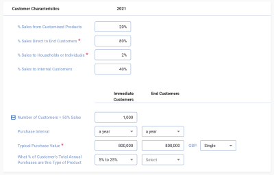 The Customer Characteristics section is split in 2 halves. The first asks for details of customisation and the types of customers you sell to, namely: