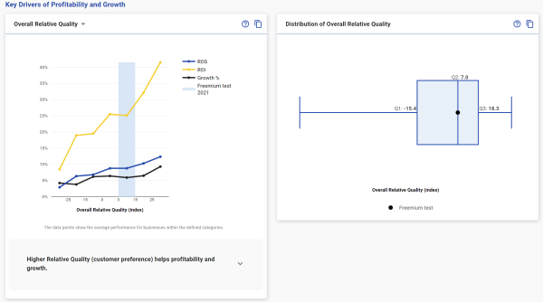 The bottom section shows two charts. To the left are charts detailing the relationship between key factors and profitability and growth from the PIMS research database with your data plotted in the same way as in the input sections. The chart to the right shows the distribution of that data in the PIMS database as a Box and whiskers chart, the end points represent the maximum & minimum and the box the middle 50% of businesses for that variable.