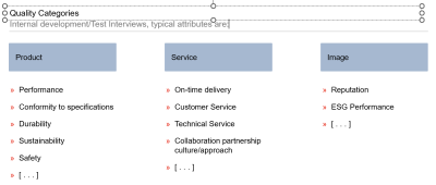 The categories can be arbitrary, but we find are a good way of helping focus on what is important and how they might relate back to internal processes. Generally we find that in commodity markets where there is little to differentiate the product, service attributes in particular become more important to the customer. The attributes are defined in workshops such as this, by conducting test interviews, or a mixture.